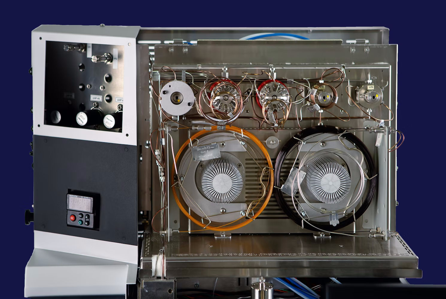 Column oven | 28 × 31 × 16 cm. Accommodates up to two 105 m × 0.530 mm id capillary columns, or two 10-ft glass packed columns (9 in. coil diameter, 1/4 in. od), or two 20-ft stainless steel packed columns (1/8 in. od). Temp range +4 to 450 °C. Goes to -80 °C with cryogenic cooling. Temperature setpoint resolution: 0.1 °C. |